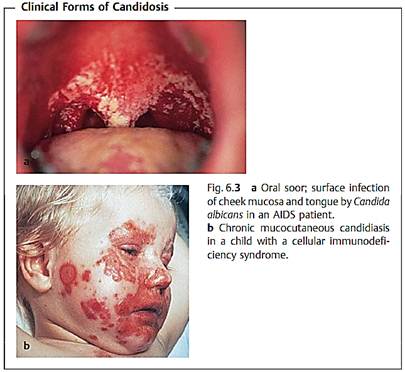 Pathogenesis and clinical pictures. Candida is a normal inhabitant of human and animal mucosa (commensal). Candida infections must therefore be considered endogenous. Candodoses usually develop in persons whose immunity is compromised, most frequently in the presence of disturbed cellular immunity. The mucosa are affected most often, less frequently the outer skin and inner organs (deep candidiasis). In oral cavity infections, a white, stubbornly adherent coating is seen on the cheek mucosa and tongue. Pathomorphologically similar to oral soor is vulvovaginitis. Diabetes, pregnancy, progesterone therapy, and intensive antibiotic treatment that eliminate the normal bacterial flora are among the predisposing factors. Skin is mainly infected on the moist, warm parts of the body. Candida can spread to cause secondary infections of the lungs, kidneys, and other organs. Candidial endocarditis and endophthalmitis are observed in drug addicts. Chronic mucocutaneous candidiasis is observed as a sequel to damage of the cellular immune system (Fig. 6.3).