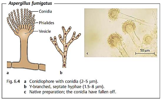 Morphology and culture. Aspergillus is recognized in tissue preparations, exudates and sputum by the filamentous, septate hyphae, which are approximately 3-4 µm wide with Y-shaped branching (Fig. 6.4).