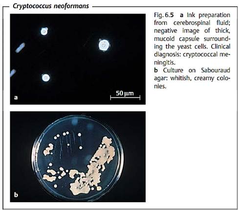 Morphology and culture. C. neoformans is encapsulated yeast. The individual cell has a diameter of 3-5 µm and is surrounded by a polysaccharide capsule several micrometers wide (Fig. 6.5a).