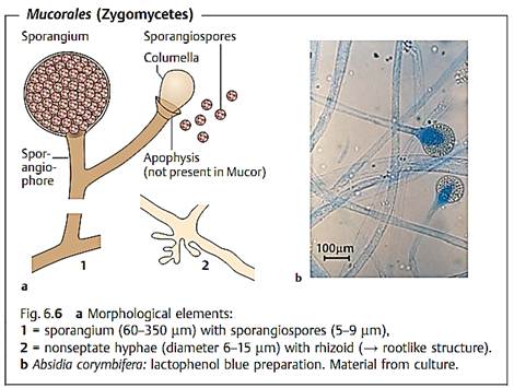 Morphology and culture. Mucorales are molds that produce broad, nonseptate hyphae with thick walls that branch off nearly at right angles (Fig. 6.6). Mucorales are readily cultured. They grow on all standard mediums, forming high, whitish-gray to brown, “fuzzy” aerial mycelium.