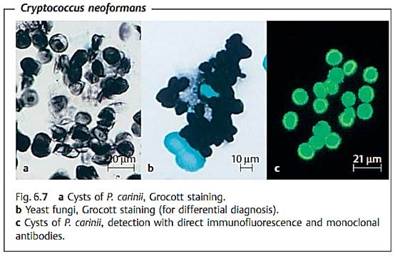 Pneumocystis carinii is a single-celled, eukaryotic microorganism that was originally classified as a protozoan, but is now considered a fungus. This pathogen can cause pneumonia in persons with defective cellular immune systems, in particular those showing AIDS. Extrapulmonary manifestations are also recorded in a small number of cases. Laboratory diagnostic methods include direct detection of the microbes under the microscope, by means of direct immunofluorescence or PCR. Appropriate anti-infective agents for therapy include cotrimoxazole, pentamidine, or a combination of the two.