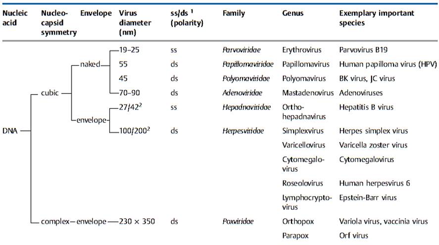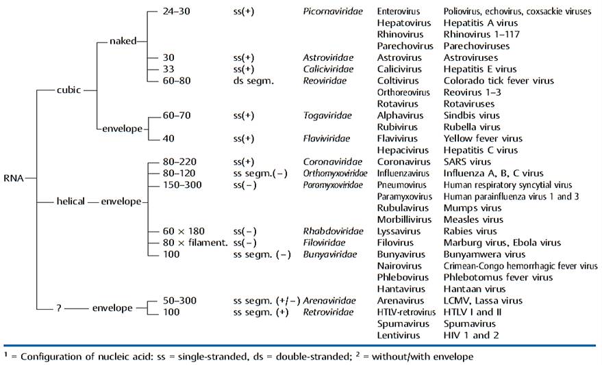 -Genome: DNA or RNA genome (important basic differentiation of virus types!) as well as configuration of nucleic acid structure: single-stranded (ss) or double-stranded (ds); RNA viruses are further subclassified according to plus and minus polarity.