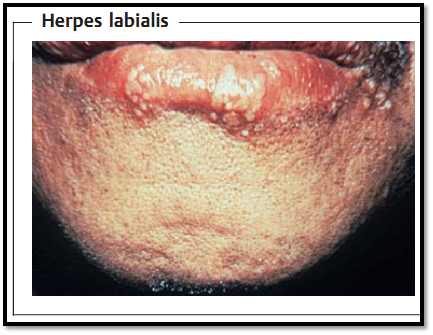 Pathogen, pathogenesis, and clinical picture. The viral genome codes for about 90 proteins, categorized as “immediate early” (regulatory functions), “early” (DNA synthesis), and “late” (structural) proteins. Herpes simplex viruses are classified in types 1 and 2, which differ both serologically and biologically (host-cell spectrum, replication temperature). Initial infection with herpes simplex type 1 usually occurs in early childhood. The portal of entry is normally the oral mucosa (“oral type”) and the infection usually manifests as a gingivostomatitis. The viruses then wander along axons into the CNS, where they persist in a latent state in the trigeminal (Gasseri) ganglion. As with all herpesviruses, the pathogen remains in the macroorganism permanently after the primary infection. Following reactivation (endogenous recidivation), the viruses follow the same route back to the periphery, where they cause the familiar vesicular exanthem (“fever blisters,” herpes labialis, Fig. 1). Despite established immunity, such recidivations can manifest repeatedly because the viruses wander within the nerve cells and do not enter the intercellular space, thus remaining beyond the reach of the immune defenses. Possible complications include keratoconjunctivitis and a highly lethal form of encephalitis.