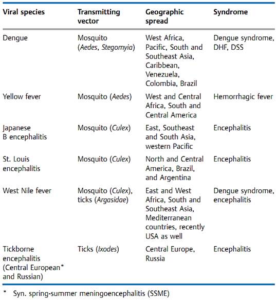 Viruses in the flavivirus family (Flaviviridae) include the genera Flavivirus, Hepacivirus, and Pestivirus. Flaviviruses (the prototype being the yellow fever virus [Latin: flavus, yellow]) are transmitted by arthropods. They cause a bi- phasic infection that can have serious consequences (hemorrhagic fever with a high lethality rate). In southern and eastern countries, these viruses are significant human pathogens. Only one representative of this family, the tick- borne encephalitis pathogen, is encountered in Europe.