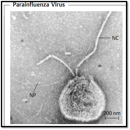 All paramyxoviruses have a similar structure (Fig. 1). They are pleomorphic. The smallest forms are 120-150 nm in size (with the exception of the somewhat smaller RS virus). They also possess an envelope that encloses the nucleocapsid. The genome consists of a continuous, single-stranded antisense RNA. The envelope is derived from the cell membrane. Various viral proteins are integrated in the envelope, visible in the form of spikes. The generic taxons are based on these spikes: parainfluenza and mumps viruses have two types of spikes, one containing the hemagglutinin (i.e., possessing hemagglutination activity) coupled with neuraminidase (HN protein), and the other the so-called fusion (F) protein, responsible for fusion of the envelope with the cell membrane. Measles viruses contain no neuraminidase and pneumoviruses possess only the F protein.