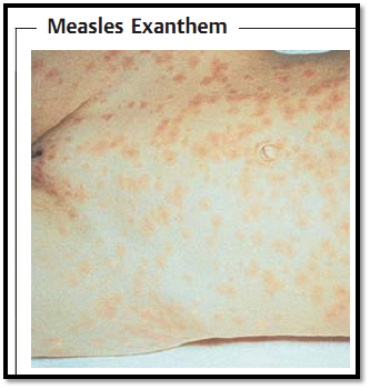 -Measles. The pathogenesis of measles has not been fully explained. It is assumed that the virus, following primary replication in lymphoid tissues, is distributed hematogenously in two episodes. Thereafter the oral mucosa displays an enanthem and the tiny white “Koplik's spots.” Then the fever once again rises and the typical measles exanthem manifests (Fig. 2). Possible complications include otitis in the form of a bacterial superinfection as well as pneumonia and encephalitis. A rare late sequel of measles (one case per million inhabitants) is subacute sclerosing panencephalitis (SSPE) in which nucleocapsids accummulate in brain cells, whereby few or no viral progeny are produced for lack of matrix protein. This disease occurs between the ages of one and 20, involves loss of memory and personality changes, and usually results in death within six to 12 months.