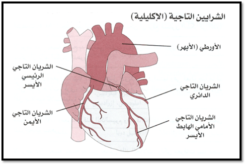 يتفرع من جداء الجزء الصاعد من الشريان الابهر الشرايين التاجية او الاكليلية التي تنقسم الى شريان ايمن ويغذي الجزء الايمن من القلب وشريان ايسر ويغذي الجزء الايسر من القلب هذان الشريانان ما يلبثان ان يتفرعان الى تفرعات اصغر فاصغر تنتهي بشعيرات دموية صغيرة تقوم بتغذية القلب بالكامل وأي انسداد في هذه الشرايين التاجية يؤدي الى نقص في تروية جدار القلب وبالتالي لا يصل اليه الاكسجين الكافي لأداء وظيفته فيموت هذا الجزء من الجدار الذي يغديه الشريان المسدود ويصاب بالاحتشاء الذي يظهر على شكل عرض الذبحة الصدرية التي يشكو منها المريض .