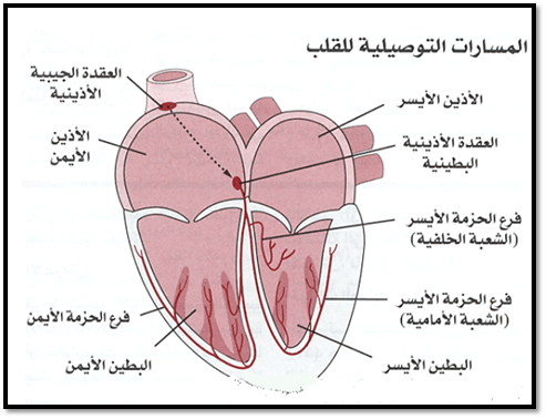- العقدة الجيبية البطينية التي تقع في جدار الاذين الايمن بالقرب من الصمام الثلاثي الشرفات ويربط بين العقدتان الياف عضلية عصبية ويتدلى ايضا من العقد الياف عضلية عصبية تمتد على طول جانبي الحاجز العضلي الذي يفصل بينها التي من ثم تمتد على طول جدار البطين وتتفرع تفرعات اصغر فاصغر الى كل انحاء جدار البطينين .
