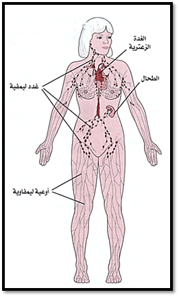 تعتبر الغدة اللمفاوية اهم اجزاء الجهاز اللمفاوي ويصل عددها الى نحو 700-600 غدة ويتراوح حجمها ما بين حجم العدس وحجم حبة اللوز وهي تتوزع في كل الجسم على شكل مجموعات اهمها المجموعات الموجودة في الصدر والبطن وتحت الابطين .