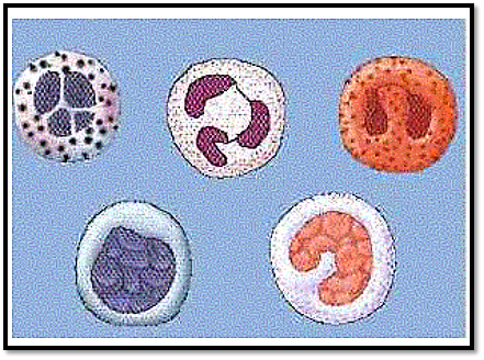 - تتكون الكريات الحبيبية في نخاع العظيم وهي كريات بعمية بإمكانها ابتلاع الاجسام الغريبة كالبكتيريا ويزداد نشاطها في حالة وجود أي تلف نسيجي .