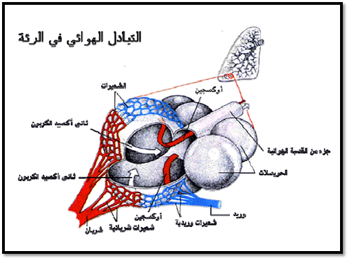 تتكون كل رئة من وحدات صغيرة جدا تسمى بالحويصلات الهوائية (انظر الرسم) التي يحيط بها من الخارج شبه من الشعيرات الدموية التي عندها يحدث عملية تبادل الغازات بين الهواء الخارجي والدم بحيث ينتقل الاكسجين من تجويف الحويصلات الهوائية الى الدم في الشعيرات الهوائية ومنه الى سائر انسجة الجسم المختلفة وينتقل ثاني اكسيد الكربون من الدم الذي في الشعيرات الدموية الى تجويف الحويصلات الهوائية ليطرد الى خارج الجسم بالزفير.