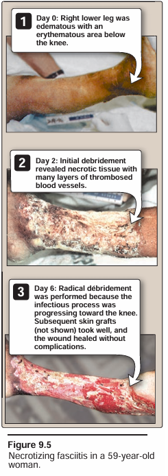 5. Invasive group A streptococcal disease: Common during the first half of the century, invasive group A streptococcal (GAS) disease became rare until its resurgence during the past decade. Patients may have a deep local invasion either without necrosis (cellulitis) or with it (necrotizing fasciitis/myositis) as shown in Figure 9.5. [Note: The latter disease led to the term "flesh-eating bacteria."] Invasive GAS disease often spreads rapidly, even in otherwise healthy individuals, leading to bacteremia and sepsis. Symptoms may include a toxic shock-like syndrome, fever, hypotension, multiorgan involvement, a sunburnlike rash, or a combination of these symptoms.
