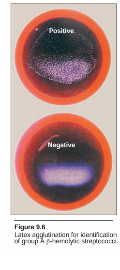 Rapid latex antigen kits for direct detection of group A streptococci in patient samples are widely used. In a positive test, the latex particles clump together, whereas in a negative test, they stay separate, giving the suspension a milky appearance (Figure 9.6). These tests have high specificity but variable sensitivity compared with culture techniques. Specimens from patients with clinical signs of pharyngitis and a negative antigen detection test should undergo routine culturing for streptococcal identification. Depending on the form of the disease, specimens for laboratory analysis can be obtained from throat swabs, pus and lesion samples, sputum, blood, or spinal fluid. S. pyogenes forms characteristic small, opalescent colonies sur- rounded by a large zone of β hemolysis on sheep blood agar . [Note: Hemolysis of the blood cells is caused by steptolysin S, which damages mammalian cells resulting in cell lysis.] This organism is highly sensitive to bacitracin, and diagnostic disks with a very low concentration of the antibiotic inhibit growth in culture . S. pyogenes is also catalase negative and optochin resistant. Group A C-substance can be identified by the precipitin reaction. Serologic tests detect a patient's antibody titer to streptolysin O (ASO test) after group A streptococcal infection. Anti-DNase B titers (ADB test) are particularly elevated following streptococcal infections of the skin.