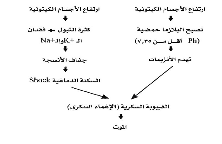 osis يؤدي عدم التحكم في المرض بطريقة صحية إلى تراكم الأجسام الكيتونية في الدم نتيجة لأكسدة الدهون غير الكاملة كمصدر رئيس للطاقة والأجسام الكيتونية عبارة عن أحماض سامة يرافق ارتفاع مستواها في الدم ارتفاع لمستوى الجلوكوز في الدم Hyperglycemia.