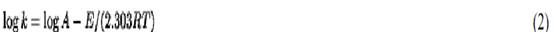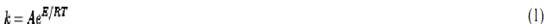 where A and E are constants, R is the gas constant, and T is the absolute temperature in Kelvin units. The activation energy E is the height of the energy barrier that the reaction must exceed to pass from reactants to products. It is usually expressed in kilocalories per mole or in joules per mole. Equation 1 can be expressed as: