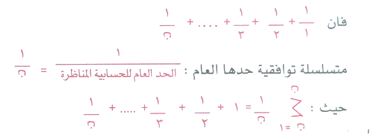 فالحد العام للمتسلسلة التوافقية = مقلوب الحد العام للمتسلسلة الحسابية المناظرة فإذا انت المتسلسلة 1 + 2 + 3 + ........ + ن حسابية وهي كذلك .