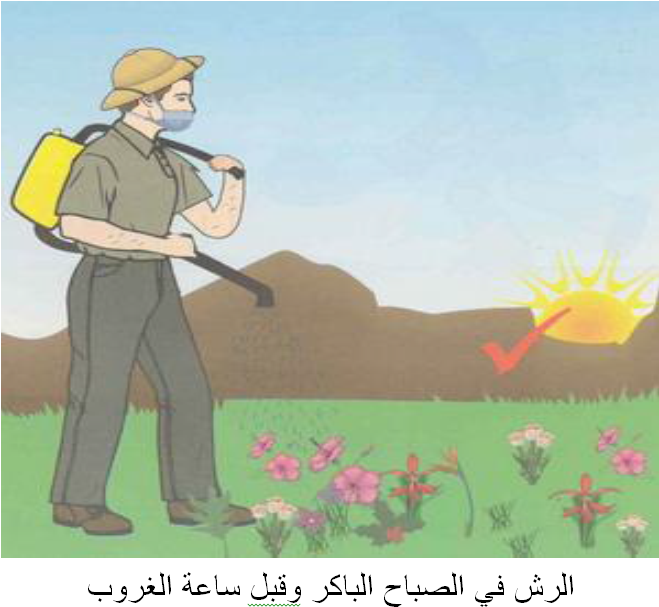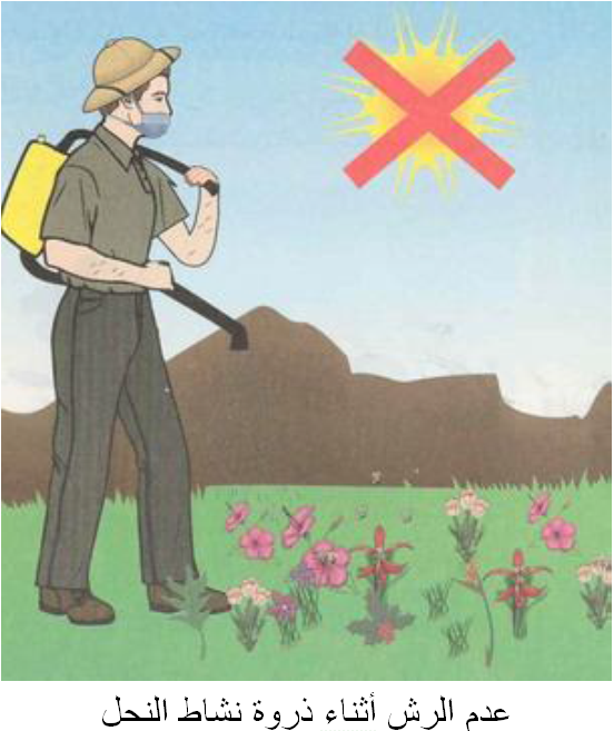 * و يفضل أن يتم الرش في الصباح الباكر أو قبيل ساعات الغروب لمنع تعرض النحل للمبيدات بشكل مباشر.