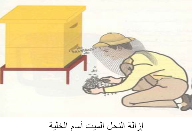 - تواجد كميات من النحل الميت على باب الخلية وحولها بشكل عشوائي.
