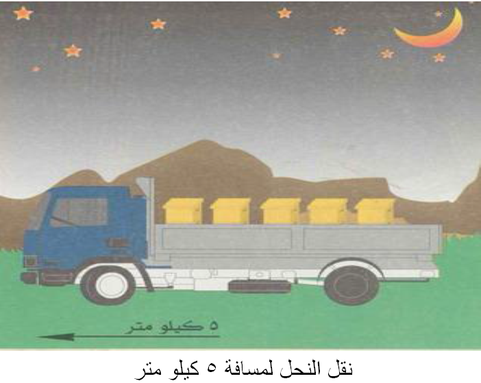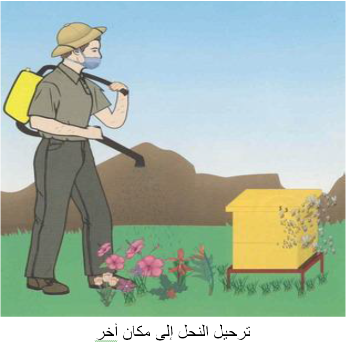 * إذا كانت مدة تأثير المبيد تزيد عن يومين يفضل ترحيل النحل حتى نهاية تأثير المبيد الى موقع يبعد 5 كيلومترات على الأقل.