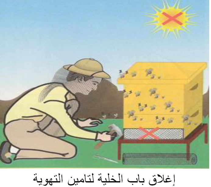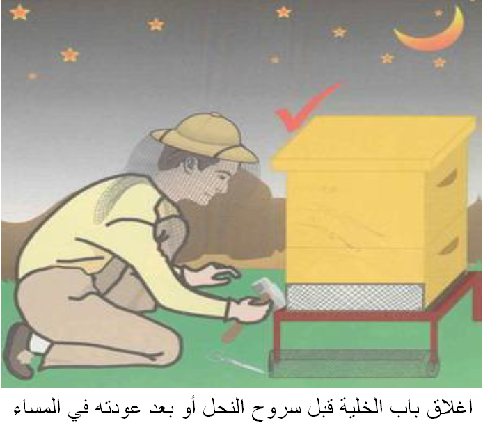 * يتم اغلاق الخلية قبل موعد الرش إما في الصباح الباكر قبل سروح النحل أو بعد عودة النحل الى الخلية مساءاً.