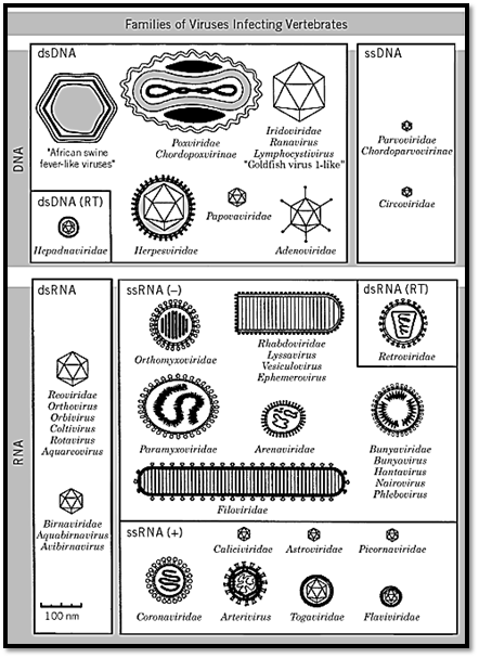 Figure 1. Families of viruses infecting invertebrates and vertebrates. Frames separate taxa containing double-stranded (ds) and single-stranded (ss) genomes. Horizontal blocks separate taxa containing DNA and RNA viruses. Taxa containing reverse transcribing (RT) viruses and the negative (–) and positive (+) ss RNA genomes are also indicated. A dotted or hairy outer layer indicates an enveloped virus. Icosahedral structures designate nonenveloped viruses .