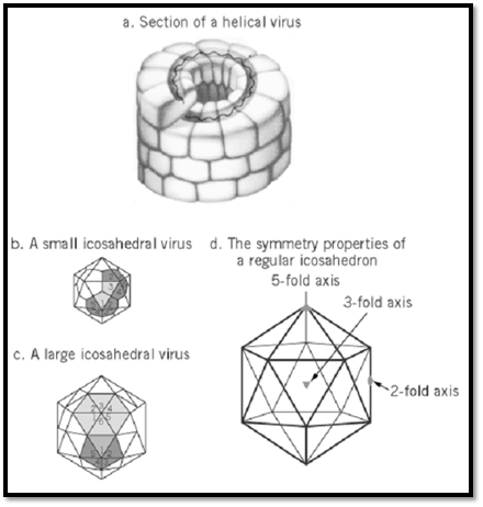 Figure 3. Structure of viruses. (a) A helical virus. The wavy red line represents RNA protected within successive arrays of proteins. (b, c) Spherical viruses. Icosahedral capsids have vertices made of symmetrically organized pentons. Hexons make the faces and are arranged along the edges. (From Ref. 19, with permission). (d) The fivefold, threefold and twofold symmetry axes of a regular icosahedron.