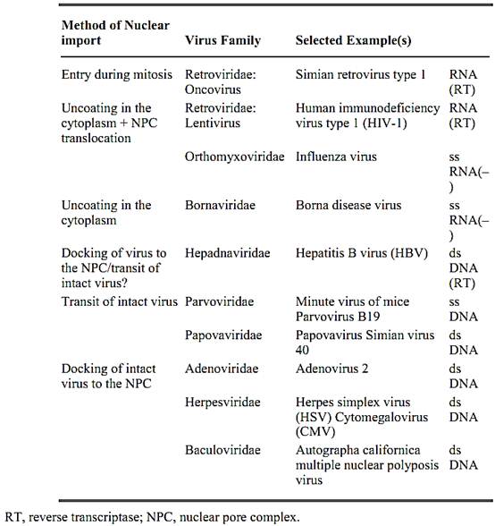 Virus nuclear import (12, 13) is illustrated in Figure 4 and summarized in Table 1. Engulfed in an endosome, adenovirus capsid external protein causes disruption of the endosomal membrane. Freed in the cytosol, the capsid interacts with the nuclear pore complex through a penton structure at one vertex. Viral DNA and associated proteins penetrate the nucleus, leaving behind the empty capsid. Similar mechanisms mediate the transport of herpesvirus capsids to the nucleus. This enveloped virus fuses at the plasma membrane; the capsid moves to the nucleus along microtubules. The capsid-nuclear pore interaction involves one vertex. DNA and associated proteins penetrate the nucleus.