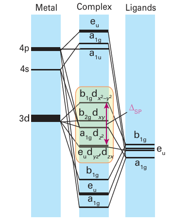 Key point: With strong-field ligands, a square-planar complex has only eight bonding MOs, thus a 16-electron configuration is the most energetically favourable configuration. One other geometry already discussed in the context of coordination chemistry is the square-planar arrangement of four ligands (Section 20.1), where we noted that it occurred only for strong-field ligands and a d8 metal ion. Because organometallic ligands often produce a strong field, many square-planar organometallic compounds exist. Stable square planar complexes are normally found with a total of 16 valence electrons, which results in the population of all the bonding and none of the antibonding MOs (Fig. 22.2). The ligands in square-planar complexes can normally provide only two electrons each, for a total of eight electrons. Therefore, to reach 16 electrons, the metal ion must provide an additional eight electrons. As a result, organometallic compounds with 16 valence electrons are common only on the right of the d block, particularly in Groups 9 and 10 (Table 22.1). Examples of such complexes include [Ir(CO)Cl (PPh3 )2] (6) and the anion of Zeise’s salt, [Pt(C2H4) Cl3]- (1). Square-planar 16-electron complexes are particularly common for the heavier elements in Groups 9 and 10, especially for Rh(I), Ir(I), Pd (II), and Pt (II), because the ligand-field splitting is large and the ligand-field stabilization energy of these complexes favours the square-planar configuration.