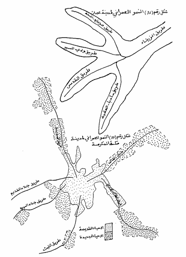 حيث تظهر المراكز العمرانية فوق المناطق الملائمة قافزة المناطق الوعرة غير الملائمة من وديان وجبال ومستنقعات، وقد تنعكس أثار ذلك على توفير الخدمات المختلفة من نقل وصحة وتعليم وماء وكهرباء وأمن وهاتف ومجاري إذ ترتفع تكاليف توفر تلك الخدمات مع قلة عدد السكان المستفيدين منها وتعاني من تلك المشاكل الدول ذات الدخل الاقتصادي المحدود. وتعد مدينة عمان من المدن التي نمت في اتجاهات عدة وبشكل غير متجانس لوعورة المنطقة لذلك تظهر بشكل يشبه أصابع اليد وكذلك الحال مدينة مكة المكرمة التي نشأت في وادي إبراهيم عليه السلام حيث تحيط بها المرتفعات من عدة جهات، وبعد نمو أو امتداد العمران على جميع المناطق الممكن استغلالها وحتى سفوح الجبال والتي يصل انحدار بعضها 45° ، بدأ العمران ينتقل إلى المناطق الواقعة وراء الجبال وعلى امتداد الطرق الرئيسية الخارجية من مركز المدينة إلى المناطق المجاورة فأصبح شكل المدينة مشتتاً وقد كان للتضاريس الإسهام الفاعل في ظهور أنماط مختلفة من النمو العمراني كالنووي والشعاعي والشريطي والمتناثر والدائري.