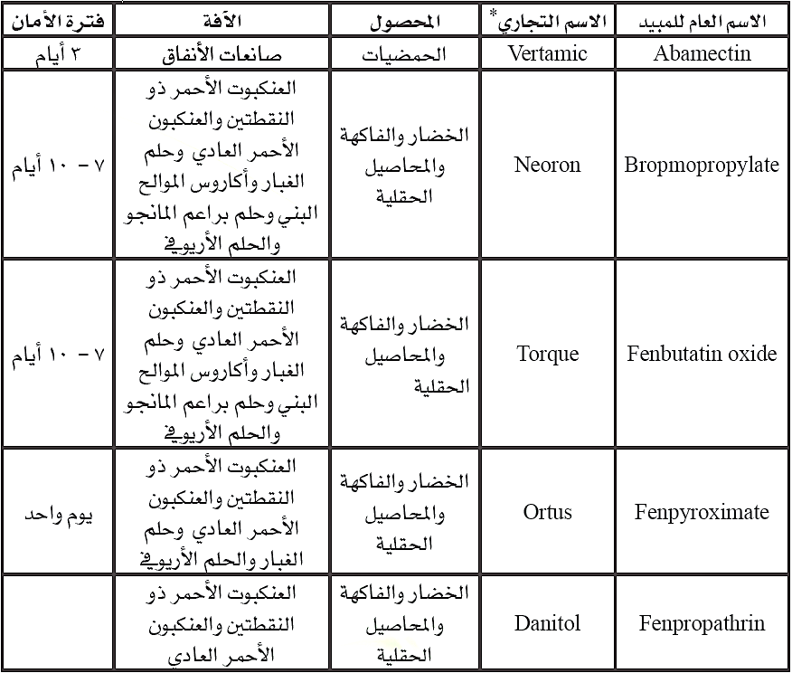 أمثلة لبعض المبيدات المستخدمة في مكافحة العناكب