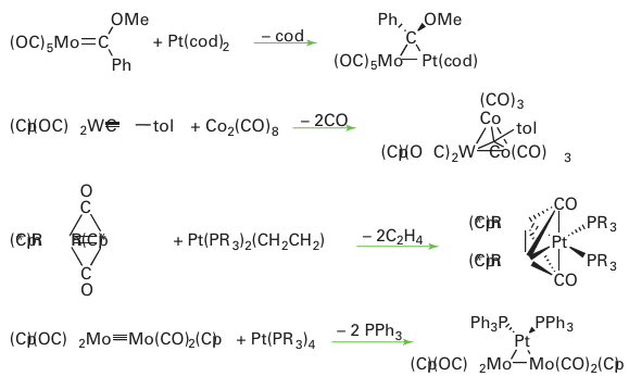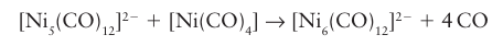 The Ni5 complex has a CVE of 76 whereas the Ni6 complex has a count of 86. The descriptive name redox condensation is often given to reactions of this type, which are very useful for the preparation of anionic metal carbonyl clusters. In this example, a trigonal-bipyramidal cluster containing Ni with formal oxidation number -2/5 and Ni(CO)4 containing Ni(0) is converted into an octahedral cluster having Ni with oxidation number -1/3. The [Ni5 (CO)12 ]2- cluster, which has four electrons in excess of the 72 expected for a trigonal bipyramid, illustrates a fairly common tendency for the Group 10 metal clusters to have an electron count in excess of that expected from the Wade-Mingos-Lauher rules. A third method, pioneered by F.G.A. Stone, is based on the condensation of an or ganometallic complex containing displaceable ligands with an unsaturated organometallic compound. The unsaturated complex may be a metal alkylidene, LnM=CR2, a metal alkylidyne, Ln MCR, or a compound with multiple metal-metal bonds: