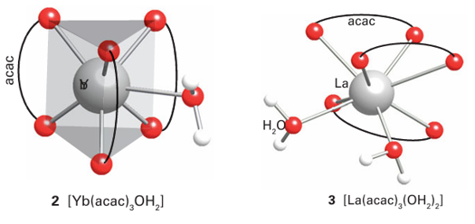 Key point: High coordination numbers with ligands adopting geometries that minimize interligand repulsions are the norm for the lanthanoids. The adoption by the relatively large, hard Lewis acid Ln3 ions of structures with high coordination numbers and with a variety of coordination environments in the solid state is repeated in solution. The variation in structure adopted is consistent with the view that the spatially buried f electrons have no significant stereochemical influence, and consequently ligands adopt positions that minimize interligand repulsions. In addition, polydentate ligands must satisfy their own stereochemical constraints, much as for the s-block ions and Al3 complexes. For example, many lanthanoid complexes have been formed with crown ether and -diketonate ligands. The coordination numbers for [Ln (OH2) n]3+ in aqueous solution are thought to be 9 for the early lanthanoids and 8 for the later, smaller members of the series, but these ions are highly labile and the measurements are subject to consider able uncertainty. Similarly, a striking variation is observed for the coordination numbers and structures of lanthanoid salts and complexes. For example, the small ytterbium cation, Yb3+, forms the seven-coordinate complex [Yb(acac)3(OH2)], and the larger La3+ is eight coordinate in [La(acac)3 (OH2)2]. The structures of these two complexes are approximately a capped trigonal prism (2) and a square antiprism (3), respectively. The partially fluorinated -diketonate ligand [C3F7 COCHCOC(CH3)3]−, nicknamed fod, produces complexes with Ln3 that are volatile and soluble in organic solvents. On account of their volatility, these complexes can be used as precursors for the synthesis of lanthanoid-containing materials by vapour deposition, such as the high temperature superconductors (Section 25.5).