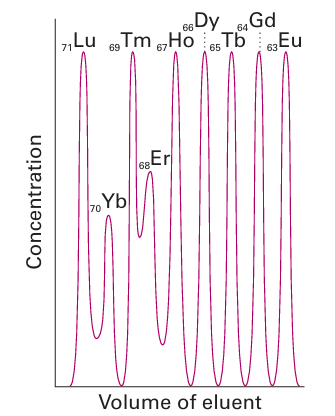Figure 23.8 Elution of heavy lanthanoid ions from a cation exchange column using ammonium 2-hydroxyisobutyrate as the eluent. Note that the higher atomic number lanthanoids elute first because they have smaller radii and are more strongly complexed by the eluent.