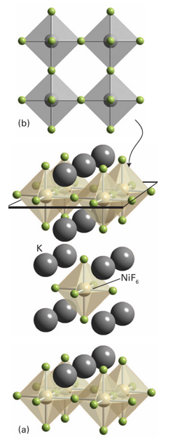 Figure 24.21 The K2NiF4 structure. (a) The displaced layers of NiF6 octahedra interspersed with K ions and (b) a view of one layer of composition NiF4 showing the corner sharing octahedra linked through F.