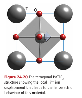 Key points: The perovskites have the general formula ABX3, in which the 12-coordinate hole of a ReO3 type BX3 structure is occupied by a large A ion; the perovskite barium titanate, BaTiO3, exhibits ferro electric and piezoelectric properties associated with cooperative displacements of the ions. The perovskites have the general formula ABX3, in which the 12-coordinate hole of BX3 (as in ReO3) is occupied by a large A ion (Fig. 24.19; a different view of this structure is given in Fig. 3.42) The X ion is most frequently O2 or F (as in NaFeF3) although nitride- and hydride-containing perovskites can also be synthesized, such as in LiSrH3. Perovskite itself is named after the naturally occurring oxide mineral CaTiO3 and the largest class of perovskites are those with the anion as oxide. This breadth of perovskites is widened by the observation that solid solutions and nonstoichiometry are also common features of the perovskite structure, as in Ba1-x Srx TiO3 and SrFeO3-y. Some metal-rich materials adopt the perovskite structure with the normal distribution of cations and anions partially inverted, for instance SnNCo3. The perovskite structure is often observed to be distorted such that the unit cell is no longer centrosymmetric and the crystal acquires an overall permanent electric polarization as a result of ion displacements. Some polar crystals are ferroelectric in the sense that they resemble ferromagnets, but instead of the electron spins being aligned over a region of the crystal, the electric dipole moments of many unit cells are aligned. As a result, the relative permittivity, which reflects the polarity of a compound, for a ferroelectric material often exceeds 1x103 and can be as high as 1.5x104; for comparison, the relative permittivity of liquid water is about 80 at room temperature. Barium titanate, BaTiO3, is the most extensively studied example of such a material. At temperatures above 120°C this compound has the perfect cubic perovskite structure. At room temperature, it adopts a lower symmetry, tetragonal unit cell in which the various ions can be considered as having been dis placed from their normal high symmetry sites (Fig. 24.20). This displacement results in a spontaneous polarization of the unit cell and formation of an electric dipole; coupling between these ion displacements and therefore the induced dipoles is very weak. Application