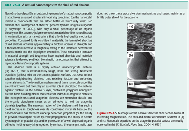 Poly(propene fumarate) (PPF) cross-linked with poly(propene fumarate)-diacrylate (PPF-DA) is an injectable, biodegradable material. Although PPF shows great potential as a material for bone tissue engineering where mechanical properties such as tensile strength are not crucial, such as the trabecular bone, its mechanical properties are inferior to those required for the more demanding human bone applications, such as cortical bone. A promising strategy to improve the mechanical properties of a polymer is to mimic the architecture of bone or to incorporate inorganic particles into the polymer matrix. For example, significant increases have been observed in the compressive mechanical properties of PPF by the incorporation of calcium phosphate. The extent to which inorganic particles modify the polymer properties is associated with their size, shape, and uniformity of dispersion, as well as with the degree of interaction between the inorganic and organic components (similar to the red abalone shell, Box 25.4). Chemically modified inorganic materials that allow for optimal dispersion and interaction with the polymer matrix therefore seem to be ideal candidates for use in bionanocomposites. A hybrid alumoxane nanoparticle, or a partially hydrolysed aluminium oxyhydroxide with surrounding organic material (Fig. 25.39), with a long carbon chain and a reactive double bond dispersed in PPF/PPF-DA, shows over a threefold increase in strength over polymer resin alone. Several approaches have been successful for attaching nucleic acids to nanoparticles, which is then followed by DNA hybridization like that mentioned in Section 25.10. Various functional inorganic nanomaterials, such as semiconductors, fullerenes, metals, and oxides, have been considered for use in bottom-up approaches to the design of systems that bridge inorganic and biological materials. One approach is to functionalize the surface of nanoparticles for selective molecular attachment; such materials are used in the development of biosensors, nanoprobes, drug transporters, and other smart devices (Box 25.5).