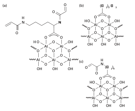 Figure 25.39 Chemical structures of modified alumoxanes: (a) diacryloyl lysine– alumoxane (activated), (b) stearic acid– alumoxane (surfactant), and (c) acryloyl undecanoic amino acid–alumoxane (hybrid). (R.A. Horch, et al., Biomacromolecules, 2004, 5, 1990.) (Reproduced with permission from the American Chemical Society.)
