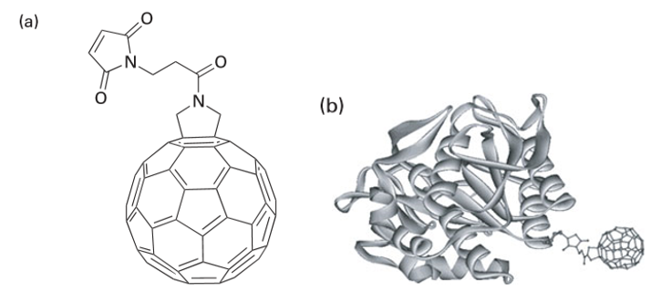 Figure 25.40 (a) Structure of N-(3maleimidopropionyl)-3,4-fulleropyrrolidine. (b) The protein conjugated to N-(3maleimidopropionyl)-3,4-fulleropyrrolidine (shown to scale). (P. Nednoor, et al., Biocon. Chem., 2004, 15, 12.)