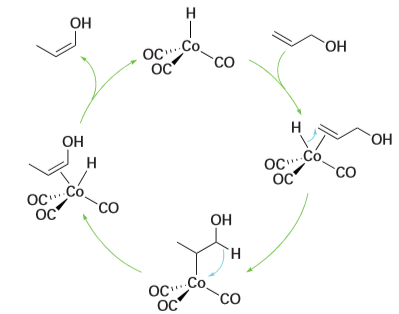 Key point: A catalytic cycle is a sequence of reactions that consumes the reactants and forms products, with the catalytic species being regenerated after the cycle. The essence of catalysis is a cycle of reactions in which the reactants are consumed, the products are formed, and the catalytic species is regenerated. A simple example of a catalytic cycle involving a homogeneous catalyst is the isomerization of prop-2-en-1-ol (allyl alcohol (CH2CHCH2OH)) to prop-1-en-1-ol (CH3CHCHOH) with the catalyst [Co (CO)3H]. The first step is the coordination of the reactant to the catalyst. That complex isomerizes in the coordination sphere of the catalyst and goes on to release the product and reform the catalyst (Fig. 26.2). Once released the prop-1-en-1-ol tautomerises to propanal (CH3CH2CHO). As with all mechanisms, this cycle has been proposed on the basis of a range of information like that summarized in Fig. 26.3. Many of the components shown in the diagram were encountered in Chapter 21 in connection with the determination of mechanisms of substitution reactions. However, the elucidation of catalytic mechanisms is complicated by the occurrence of several delicately balanced reactions, which often cannot be studied in isolation. Two stringent tests of any proposed mechanism are the determination of rate laws and the elucidation of stereochemistry. If intermediates are postulated, their detection by magnetic resonance and IR spectroscopy also provides support. If specific atom-transfer steps