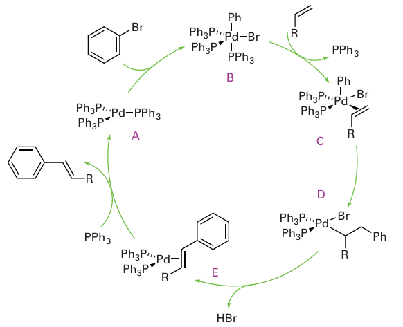 Normally, either a Pd (II) complex, such as [PdCl2 (PPh3)2], in the presence of additional phosphine or a Pd (0) compound, such as [Pd(PPh3)4], is used as the catalyst, although many other Pd/ligand combinations are active. The precise reaction pathway is unclear (and probably differs with each Pd/ligand/substrate combination) but it is apparent that all these reactions follow the same general sequence. Figure 26.11 shows an idealized catalytic cycle for the coupling of an ethenyl group with an aryl halide. An initial oxidative