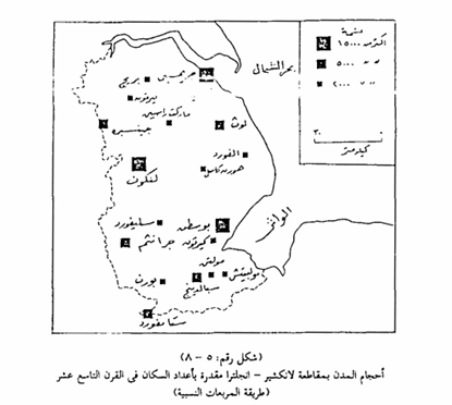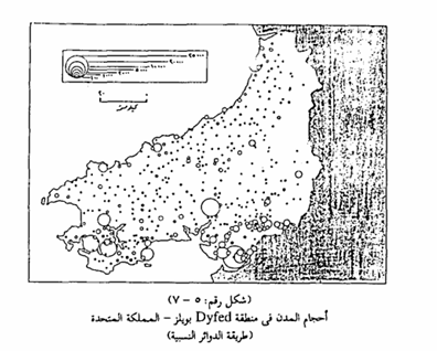 نقصد بالحجم هنا عدد سكان المدينة وليس اتساعها كمنطقة مبنية فمن الناحية الفعلية يتخذ عدد سكان المدينة مؤشراً مركباً إلى، ومقياساً عاماً، لوزن المدينة وتقييم أهميتها، ومعياراً معقولاً بوجه خاص لقيمة موقعها ، وتستخدم الدوائر النسبية بكثرة لتمثيل سكان المدن حيث يكون العدد الاجمالي لهؤلاء السكان كبيراً نسبياً، ومتركزاً في مواضع محدودة أو مساحات صغيرة جداً ، ويلاحظ أننا رسمنا الدوائر شفافة على شكل حلقات مفرغة، كما نلاحظ تلاحم وتداخل الدوائر في أماكن مجمعات المدن والضواحي الملاصقة للمدن الكبيرة، كما أنه روعي في رسم هذه الخريطة عدم كتابة أسماء المدن وعدم رسم خطوط الحدود للوحدات الإدارية الصغيرة التى تضم هذه المدن حتى لاتشوه رسالة الخريطة.