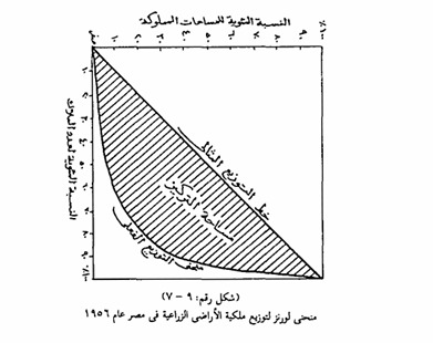 العمالة الزراعية وتوزيع ويعتمد أسلوب منحنى لورنز في التحليل على وجود توزیع نظري (مثالي) للظاهرة موضع الدراسة. ويتمثل هذا التوزيع بخط مستقيم تعطى أية نقطة عليه النسب المتساوية في التوزيع. فمثلاً إذا كنا بصدد قياس علاقة مساحة الأراضى الزراعية بالملاك، فإنه من المفروض (نظرياً) أن نسبة 10% من الملاك يمتلكون من المساحة 10% من الأراضى، كما أن 70 %الملاك يمتلكون 70% من الأراضى من وهكذا. كما يعتمد أسلوب منحنى لورنز أيضاً على وجود منحنى للتوزيع الفعلى للظاهرة ولما كان التوزيع الفعلى لأية ظاهرة يختلف حتماً عن التوزيع النظرى المثالي لها، فإن العلاقة بين منحنى التوزيع الفعلى وخط التوزيع المتساوى تحدد درجة عدالة أو سوء توزيع هذه الظاهرة ويستدل على ذلك المحصورة بين المنحنى وخط التوزيع المتساوي (مساحة التركيز أو سوء التوزيع) ، فكلما قرب المنحنى من هذا الخط كلما صغرت المساحة بينهما ودل ذلك على قرب التوزيع الفعلي من التوزيع المثالي، أو اتخذ ذلك دليلاً على عدالة التوزيع، أما إذا بعد منحنى التوزيع الفعلى عن خط التوزيع المتساوى فإن المساحة المحصورة بينهما تزداد ويدل ذلك على بعد التوزيع عن التوزيع المثالي، أو يتخذ دليل على سوء توزيع الظاهرة. وتقوم فكرة رسم منحنى لورنز على أساس تحويل التكرارات الأصلية للظاهرتين المطلوب معرفة العلاقة بينهما عدد الملاك والمساحة المملوكة إلى نسب مئوية ثم تحول هذه النسب إلى تكرارات متجمعة نسبية، ثم توقع الأخيرة على الرسم البياني المربع الشكل الذى يحتوى على محورين أفقين أحدهما يمثل التكرارات المتجمعة النسبية لعدد الملاك مثلاً، ومحورين رأسيين يمثل أحدهما أيضاً التكرارات المتجمعة النسبية لجملة المساحة المملوكة بحيث يبدأ مقياس كل محور بالصفر وينتهى برقم 100% وبعد ذلك نصل بين النقط الممثلة لتوزيع الملكية بخط ممهد يطلق عليه اسم منحني التوزيع الفعلي أو منحنى لورنز، ثم نرسم الخط المستقيم الذي يصل بين نقطتي الصفر، 100 (قطر المربع) ليمثل التوزيع النظري (المثالي) للتوزيع كما في الشكل رقم (9 - 7) الذي يوضح توزيع ملكية الأراضى الزراعية في مصر عام 1952 ويلاحظ من الشكل أن كبر مساحة التركيز بسبب بعد منحنى التوزيع الفعلي عن التوزيع المثالي، وهذا يدل على سوء توزيع الملكية الزراعية في مصر قبل صدور قوانين الاصلاح الزراعي.