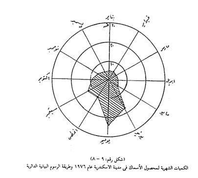 وتعتمد طريقة الرسوم الدائرية على رسم دائرة وتقسيمها إلى 12 قسماً تبعاً العدد شهور السنة بحيث يكون نصيب كل شهر 30 درجة من درجات الدائرة (360 درجة) ، ثم يرسم من مركز هذه الدائرة دوائر على مسافات متساوية من نصف قطر أكبر دائرة ، وتمثل هذه الدوائر كميات الظاهرة قيد البحث، على أن تراعى أن يشمل ذلك أقل الكميات وأكبرها فإذا كان مقدار أو كمية الظاهرة لا تقل عن الصف ففى هذه الحالة يصبح مركز الدائرة هو الصفر، فمثلاً إذا كانت لدينا بيانات عن كميات الإنتاج الشهري من الأسماك في مدينة الاسكندرية، فإنه يمكن تمثيل هذه البيانات برسم بياني دائري عن طريق رسم أنصاف أقطار على بعد متساوى من مركز الدائرة الرئيسية (الخارجية) يمثل كل منها شهرا من شهور السنة – تبعا لمقياس الرسم المختار بخط منحنى، وبذلك يتكون لدينا شكل دائرى يمثل الإنتاج الكلى للأسماك خلال تلك السنة وقد يستخدم هذا النوع من الرسوم لتمثيل عدة ظاهرات بحيث ينتج في النهاية وجود مجموعة من المنحنيات المتداخلة توقع بأشكال مختلفة أو بألوان متباينة على الرسم بنفس أسلوب الإنشاء وذلك بغرض المقارنة بين هذه الظاهرات، ولكن يشترط في هذه الحالة أن تكون تمثيل ببيانات جميع الظاهرات خاضعا لمقياس رسم واحد ، كما يمكن تظليل المساحة التي يحصرها كل منحنى على الرسم بظل أو لون معين لإبراز خصائص التوزيع التي يوضحها المنحنى الدائري.