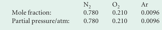 These three amounts work out as 2.69 mol, 0.725 mol, and 0.033 mol, respectively, for a total of 3.45 mol. The mole fractions are obtained by dividing each of the above amounts by 3.45 mol and the partial pressures are then obtained by multi plying the mole fraction by the total pressure (1.00 atm):