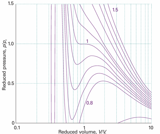 We now examine to what extent the van der Waals equation predicts the behaviour of real gases. It is too optimistic to expect a single, simple expression to be the true equation of state of all substances, and accurate work on gases must resort to the virial equation, use tabulated values of the coefficients at various temperatures, and analyse the systems numerically. The advantage of the van der Waals equation, however, is that it is analytical (that is, expressed symbolically) and allows us to draw some general conclusions about real gases. When the equation fails we must use one of the other equations of state that have been proposed (some are listed in Table 1.7), invent a new one, or go back to the virial equation. That having been said, we can begin to judge the reliability of the equation by com paring the isotherms it predicts with the experimental isotherms in Fig. 1.15. Some