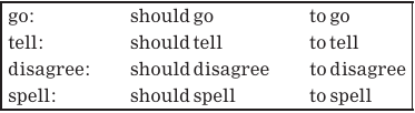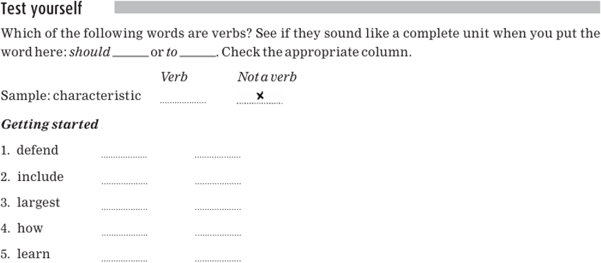 Here are some examples of verbs. You can see that they all meet the test with should and the test with to.