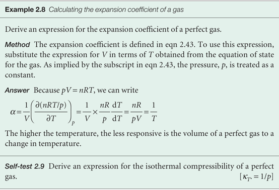 and physically is the fractional change in volume that accompanies a rise in temperature. A large value of α means that the volume of the sample responds strongly to changes in temperature. Table 2.8 lists some experimental values of α and of the isothermal compressibility, κT (kappa), which is defined as
