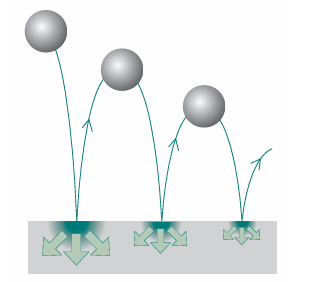 Fig. 3.2 The direction of spontaneous change for a ball bouncing on a floor. On each bounce some of its energy is degraded into the thermal motion of the atoms of the floor, and that energy disperses. The reverse has never been observed to take place on a macroscopic scale.