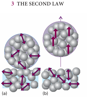 Fig. 3.3 The molecular interpretation of the irreversibility expressed by the Second Law. (a) A ball resting on a warm surface; the atoms are undergoing thermal motion (vibration, in this instance), as indicated by the arrows. (b) For the ball to fly upwards, some of the random vibrational motion would have to change into coordinated, directed motion. Such a conversion is highly improbable.