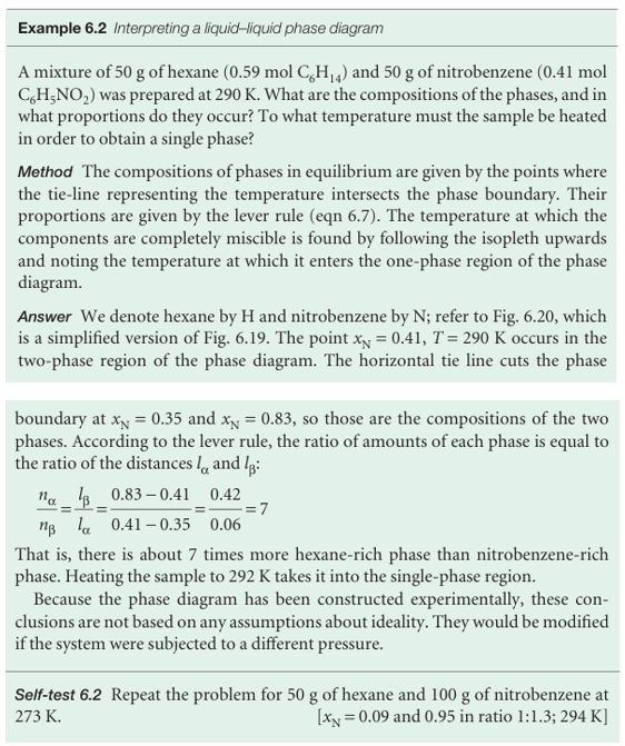 Fig. 6.20 The temperature–composition diagram for hexane and nitrobenzene at 1 atm again, with the points and lengths discussed in the text.
